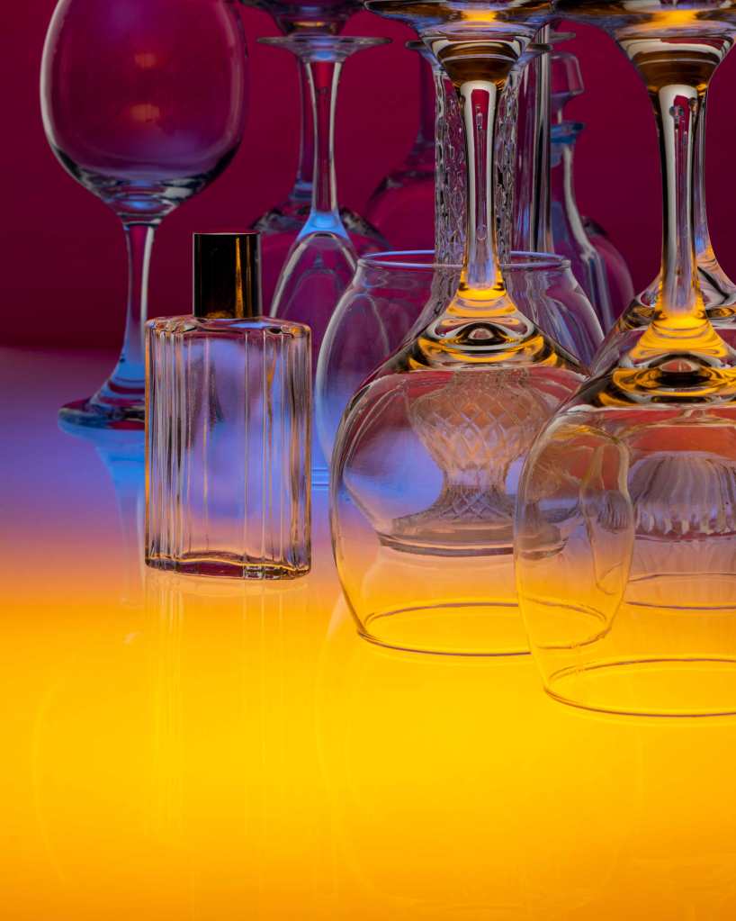 art photography, green and fuschia lights behind wine glasses, abstract art